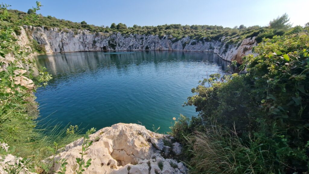 Der Drachenaugensee, im Kroatischen Zmajevo oko, befindet sich in der Marina Frapa, auf der Halbinsel Gradina. Der Süßwassersee hat die Form eines Drachenauges und misst rund 150×70 Meter. Der felsige und naturbelassene Uferbereich ist ein beliebter Ort für Familienausflüge und junge Menschen, die dort die Sonne genießen möchten. Und einmal im Jahr findet hier sogar ein Klippenspringer-Wettbewerb statt. Der See ist auch umgeben von einer interessanten Legende. Früher lebten an seinem Ufer zwei Brüder, die gemeinsam arbeiteten und ihr Einkommen teilten. Als einer der Brüder erblindete, wurde die Teilung des Besitzes problematisch. Um sicherzustellen, dass sein Bruder gerecht blieb, verlangte der blinde Bruder ein heiliges Versprechen von ihm. Aber das Gelöbnis wurde gebrochen. Daraufhin wandte sich der blinde Bruder an den Drachen im See, der für seinen strengen Sinn für Gerechtigkeit bekannt war. Der Drache tauchte aus dem Wasser auf, blies Schwefelatem auf das Land der Brüder und tötete den betrügerischen Bruder sowie alle Lebewesen auf den Feldern. Diese Tat führte zur Verödung des Landes und der blinde Bruder fand sich in einer hilflosen Situation wieder. Der Drache zog sich in den See zurück und wurde seitdem nicht mehr um Hilfe gebeten, wahrscheinlich aufgrund seines brutalen Vorgehens.
